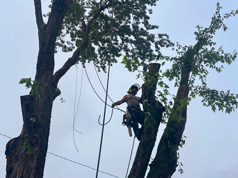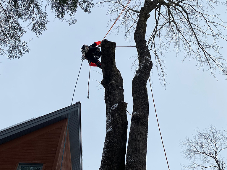 Chez Vert Tige Aménagement inc., nous débutons toujours par une évaluation minutieuse de l’arbre et de son environnement par un de nos arboriculteurs-élagueurs. Cette évaluation permet de déterminer la méthode d’abattage la plus appropriée, qu’il s’agisse d’un abattage à la grue, aux câbles ou à la nacelle, afin de réaliser l’opération de la manière la plus sécuritaire possible.